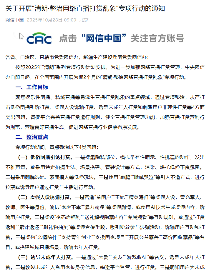 文章來源:新華社 作者: 時間:2025-10-28 09:04:46關(guān)于開展“清朗·整治網(wǎng)絡(luò)直播打賞亂象”專項行動的通知